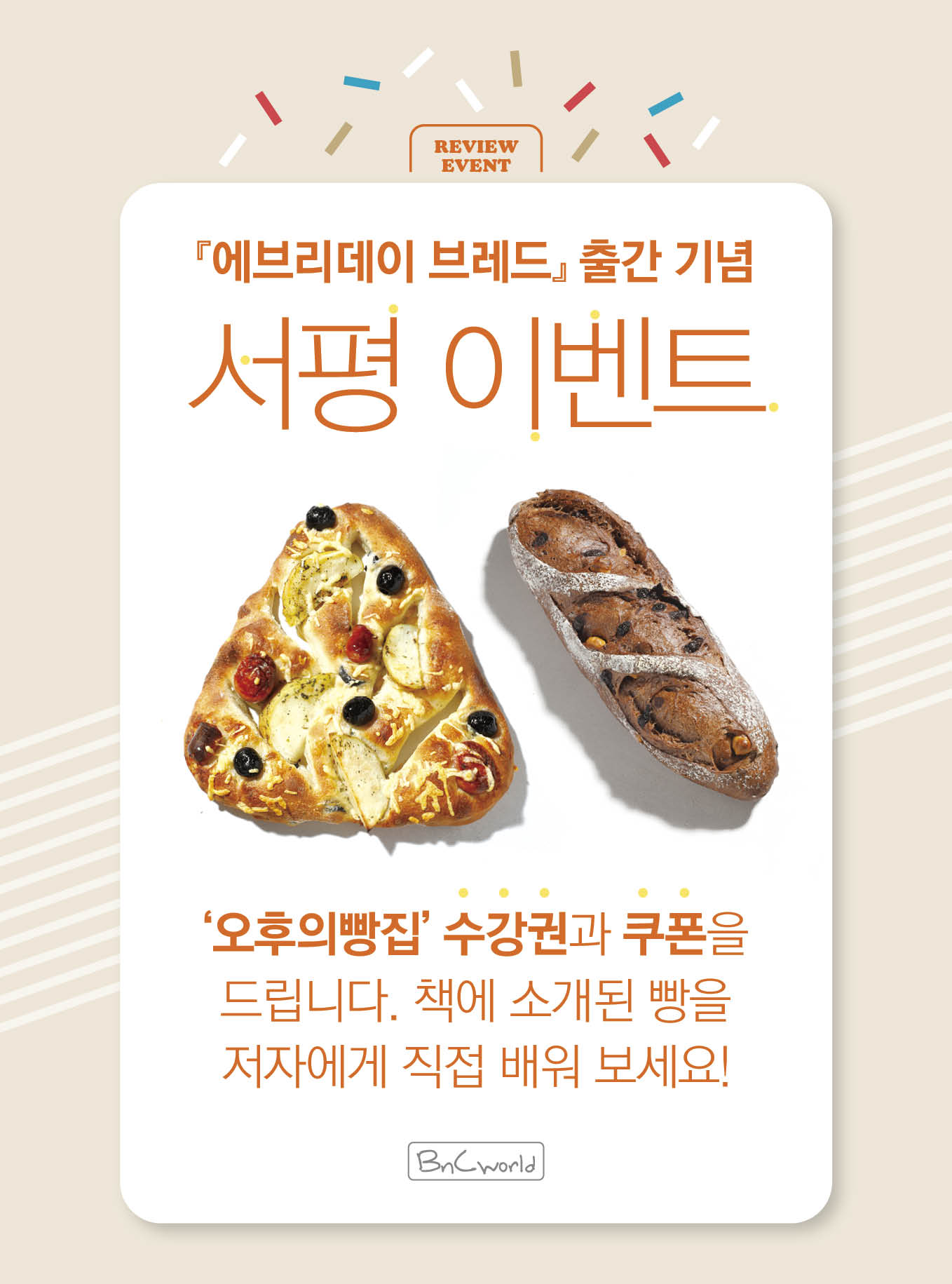 『에브리데이 브레드』 출간 기념 서평 이벤트 ‘오후의빵집’ 수강권과 쿠폰을 드립니다. 책에 소개된 빵을 저자에게 직접 배워 보세요! ▶ 경품 택① ‘오후의빵집’ 원데이 클래스 수강권(25만원 상당) 6명 택② ‘...