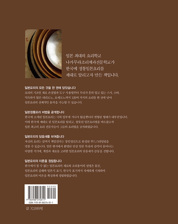 <정통일본요리>는 일본 나카무라조리제과전문학교의 정통일본요리법을 담은 요리책입니다. 일본 나카무라조리제과학교는 60년 이상의 역사와 전통을 자랑하는 명문요리학교로, 일본 유수의 조리, 제과 교육기관과 교수진들로부터 호평을 받고 있는 요리전문학교입니다. 나카무라조리제과전문학교가 속해 있는 나카무라가쿠엔 그룹은 대학과 대학원(석사/박사)을 포함하여 단기대학, 전문대학, 고등학교, 중학교, 유치원 등 13개의 학교, 7000명이 넘는 학생들이 수학하고 있는 교육그룹입니다. 특히 요리와 영양분야의 교육 및 연구에서는 일본 최고의 교육기관이라는 평가를 받고 있으며, 풍부한 인간성을 갖춘 인재 양성의 산실로 알려져 있습니다. 이러한 교육기관이 서울 분교 나카무라아카데미를 개교하였습니다. 나카무라아카데미는 일본 나카무라조리제과전문학교와 동일한 수준의 조리 설비 환경을 갖추고 있으며, 일본에서 파견되어 상주하는 일본인 강사를 비롯하여 일본 본교 교수진이 각 커리큘럼에 맞추어 강의를 하고 있습니다.