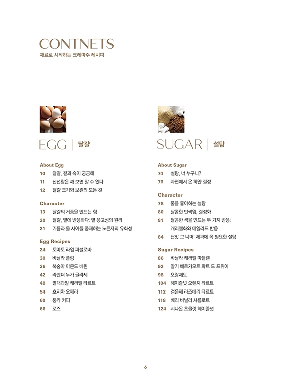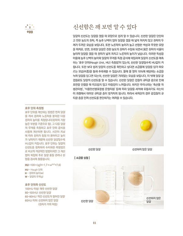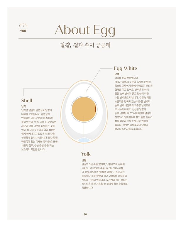 About Egg 달걀, 겉과 속이 궁금해 / 신선함은 깨 보면 알 수 있다 / 달걀 크기와 보관의 모든 것 / Character 달걀의 거품을 만드는 힘 / 달걀, 열에 반응하다: 열 응고성의 원리 / 기름과 물 사이를 중재하는 노른자의 유화성