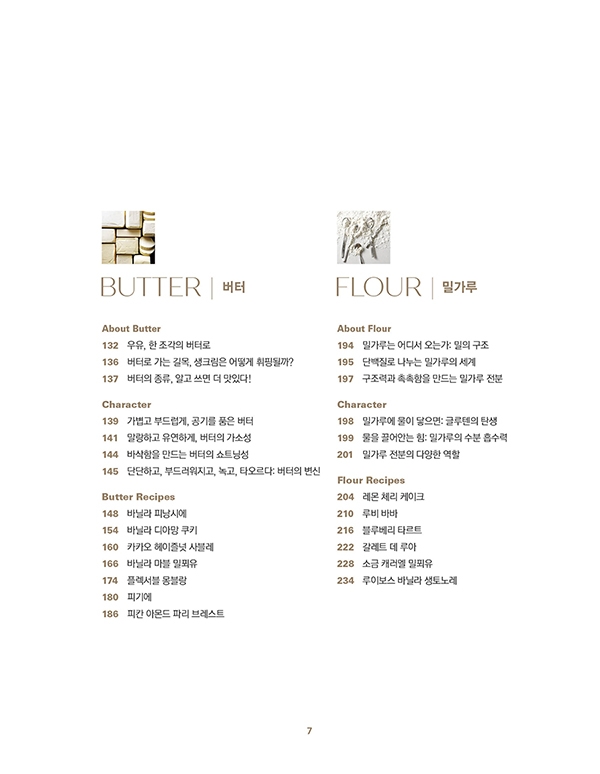 About Flour 밀가루는 어디서 오는가: 밀의 구조 / 단백질로 나누는 밀가루의 세계 / 구조력과 촉촉함을 만드는 밀가루 전분 / Character 밀가루에 물이 닿으면: 글루텐의 탄생 / 물을 끌어안는 힘: 밀가루의 수분 흡수력 / 밀가루 전분의 다양한 역할