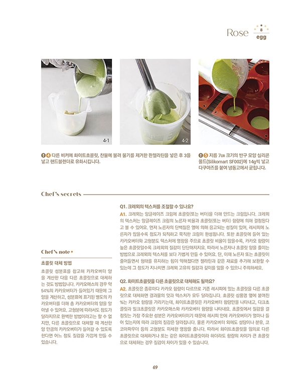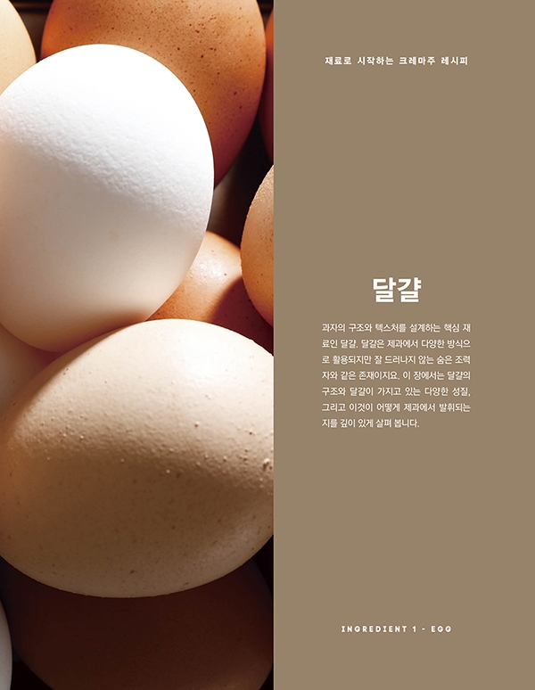 분명 같은 재료로 만드는데 왜 결과는 전혀 다른 것일까? 그 해답을 찾기 위해 이 책은 제과의 출발점이라 할 수 있는 달걀, 설탕, 버터, 밀가루, 네 가지 주재료를 탐구하는 것으로부터 시작한다. 과자 전반의 텍스처를 결정짓는 달걀, 달콤함 이상의 역할을 하는 설탕, 맛과 식감을 좌우하는 버터, 그리고 구조와 결을 만드는 밀가루 등 각 재료가 가진 특성이 각각의 단계에서 어떻게 기능하여 시그니처 제품으로 완성되는지를 생생하게 보여 준다. 이를 통해 독자는 ‘왜 순서를 지켜 작업해야 하는지’, ‘어떤 상태가 기준이 되는지’를 공정 사진을 통해 직접 눈으로 확인할 수 있으며, 재료에 대한 깊은 이해를 바탕으로 보다 자유로운 응용이 가능하다. 또한 『재료로 시작하는 크레마주 레시피』에는 그동안 <크레마주 제과 스튜디오>의 프라이빗 클래스 외 어디에서도 공개한 바 없는 크레마주 시그니처 레시피와 완벽함을 추구하는 김이슬 셰프의 생생한 팁이 가득 실려 있다. 따라서 제과 전문가라면 누구나 궁금했을 크레마주의 감각적인 디자인과 놀라운 구성의 디저트를 경험할 소중한 기회가 될 것이다.