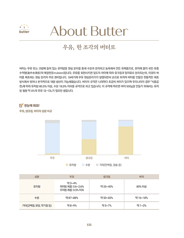 About Butter 우유, 한 조각의 버터로 / 버터로 가는 길목, 생크림은 어떻게 휘핑될까? / 버터의 종류, 알고 쓰면 더 맛있다! / Character 가볍고 부드럽게, 공기를 품은 버터 / 말랑하고 유연하게, 버터의 가소성 / 바삭함을 만드는 버터의 쇼트닝성 / 단단하고, 부드러워지고, 녹고, 타오르다: 버터의 변신